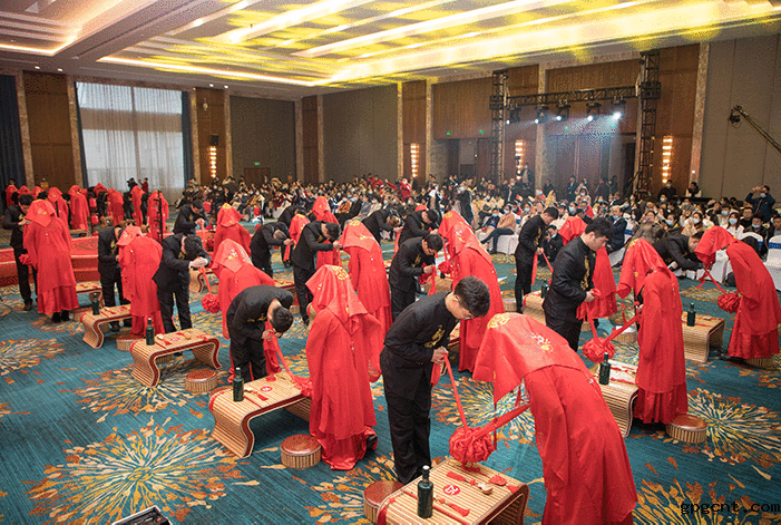 当天上午,在传统古典音乐背景中,新人们身着华服,步履优雅而庄重地进入典礼现场。在婚礼司仪的引领下,新人依次按传统婚仪,许下永结同心的誓言,结成百年之好。现场气势恢宏,充满古典浪漫气息。仪式感强的环节,以及大气磅礴、富有意义的婚礼进程,生动展现了中华优秀传统礼仪文化,让每位新人在这场不一样的中式婚礼中留下深刻印象。