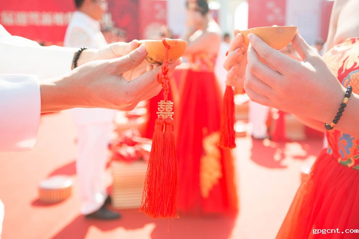 婚礼仪式上,40对新人身着华服缓缓入场,在庄重、典雅的氛围中行合卺之礼,享婚典之仪,饮爱情之酒,再现了中华民族传统婚典文化的古韵之美,还原了一场原汁原味的传统婚礼。